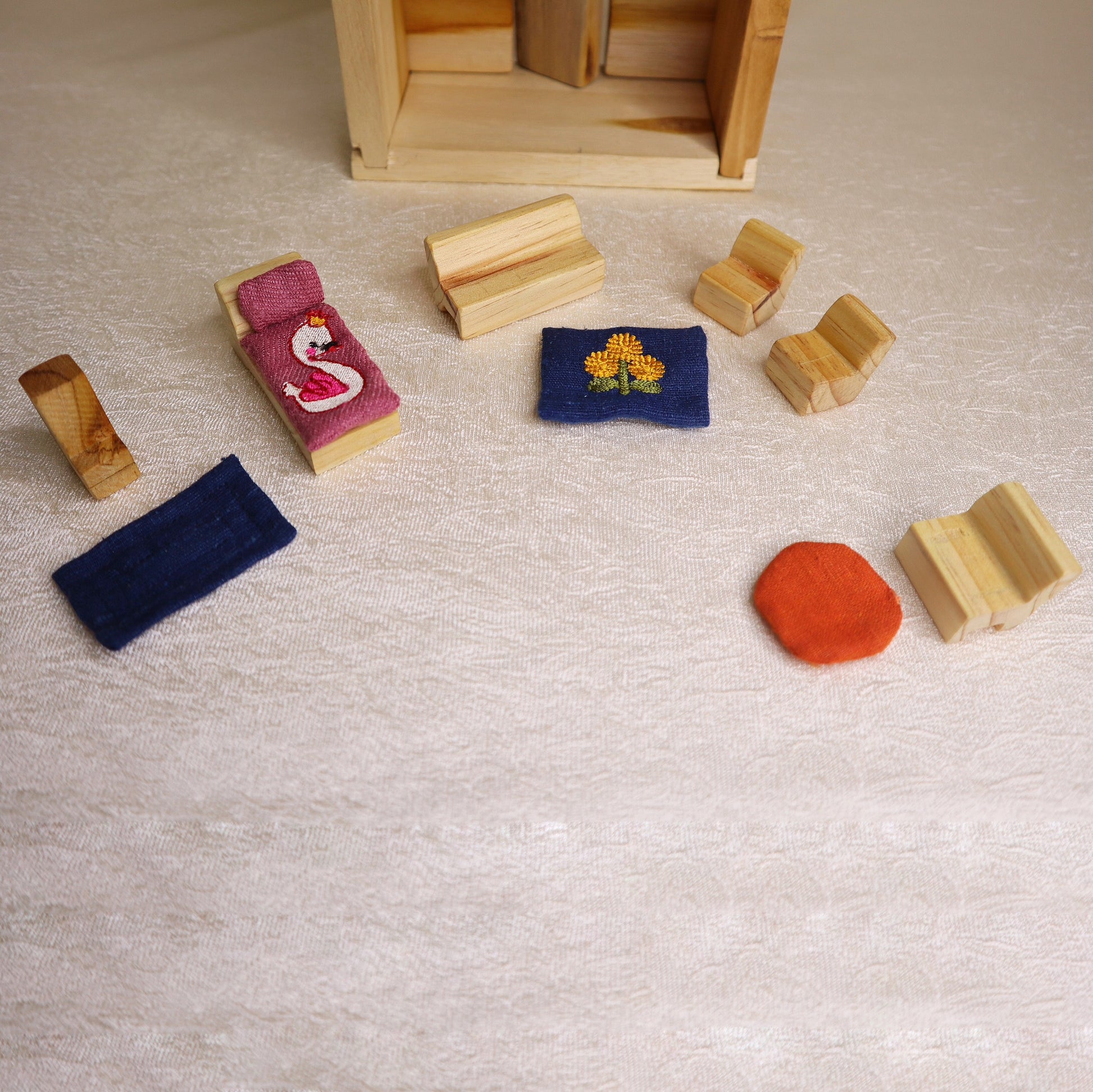 Exquisitely handcrafted wooden blocks of different shapes come together to make a little Doll House with miniature wooden furniture and luxurious silk furnishings which are delicately embroidered with charming designs.